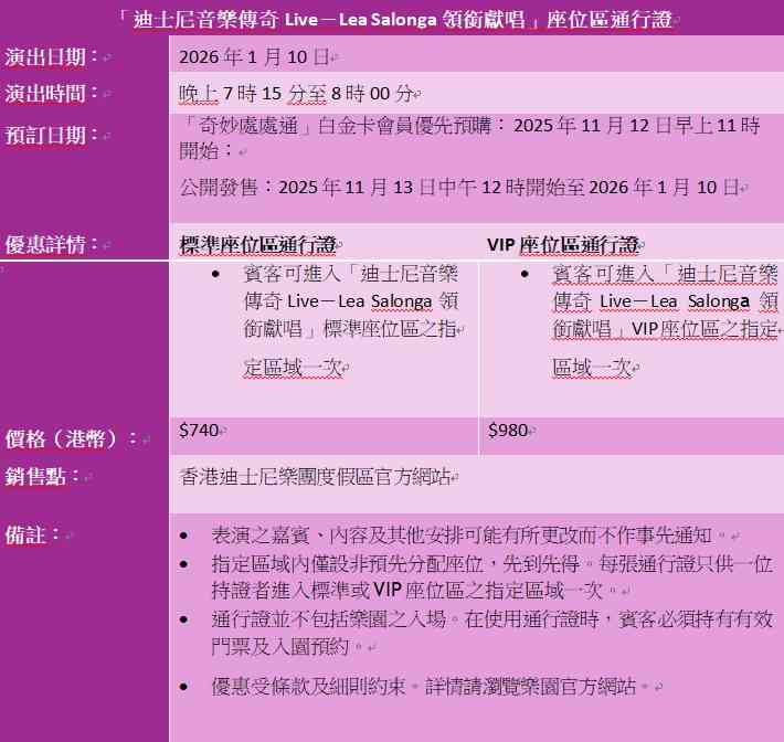 「迪士尼音乐传奇Live-Lea Salonga领衔献唱」标准及VIP座位区通行证将于2025年11月13日公开发售。「奇妙处处通」白金卡会员可于2025年11月12日优先预购。