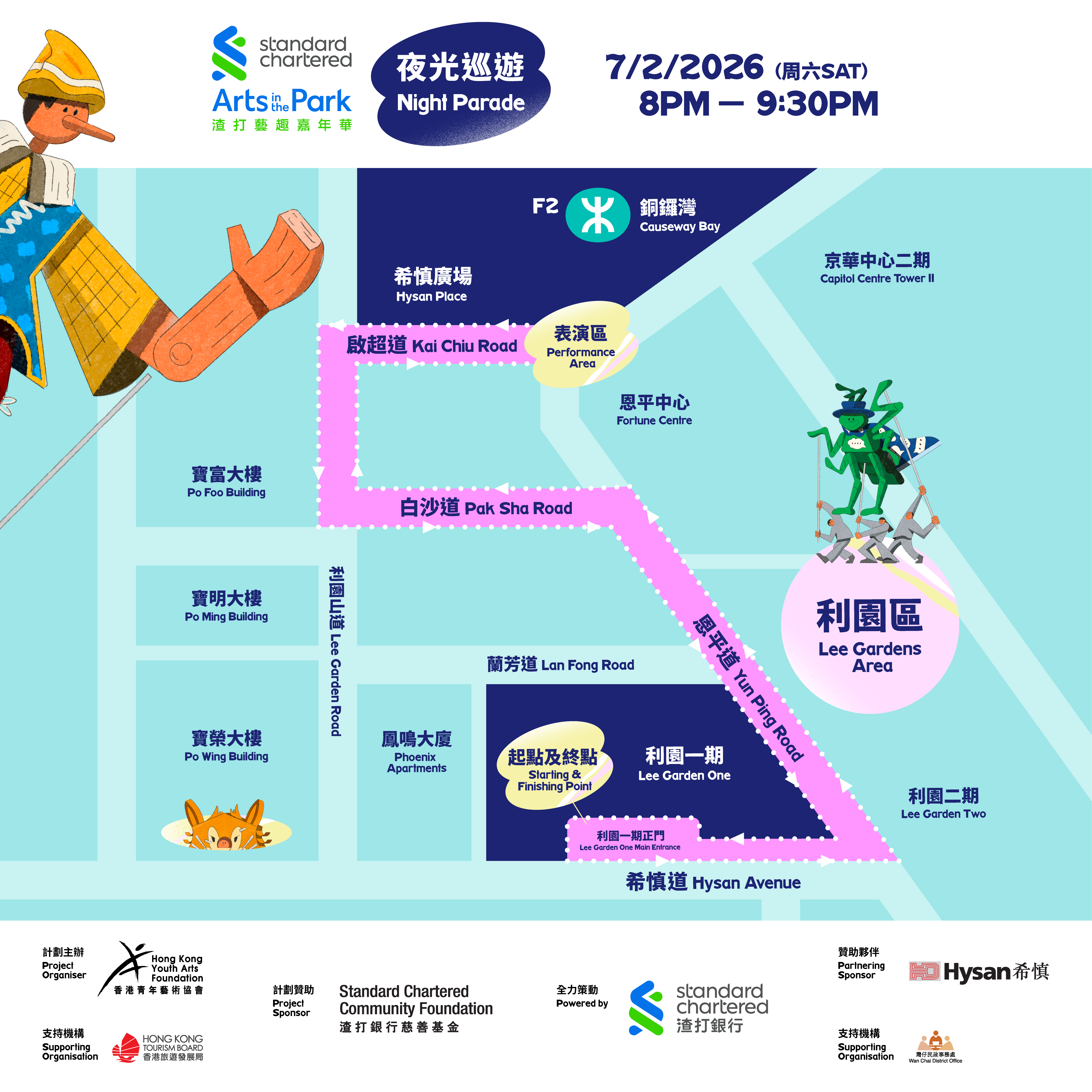 香港最具标志性的青年户外艺术活动「渣打艺趣嘉年华」举办第 25 届,以意大利经典童话《木偶奇遇记》为主题特别呈献「夜光巡游」,汇聚更丰富的艺术元素,带来震撼视觉的艺术盛宴。「夜光巡游」将于 2 月 7 日周六晚上 8 时至 9 时 30 分在铜锣湾利园区隆重登场,由利园一期正门出发,途经恩平道、白沙道、利园山道及启超道,延伸至希慎广场折返。市民可以近距离一睹本地年青艺术家独具匠心的工艺,细赏故事里目眩神迷的光影世界。