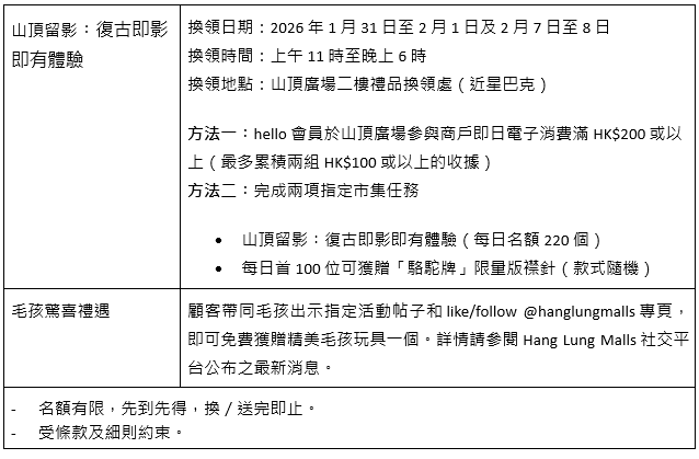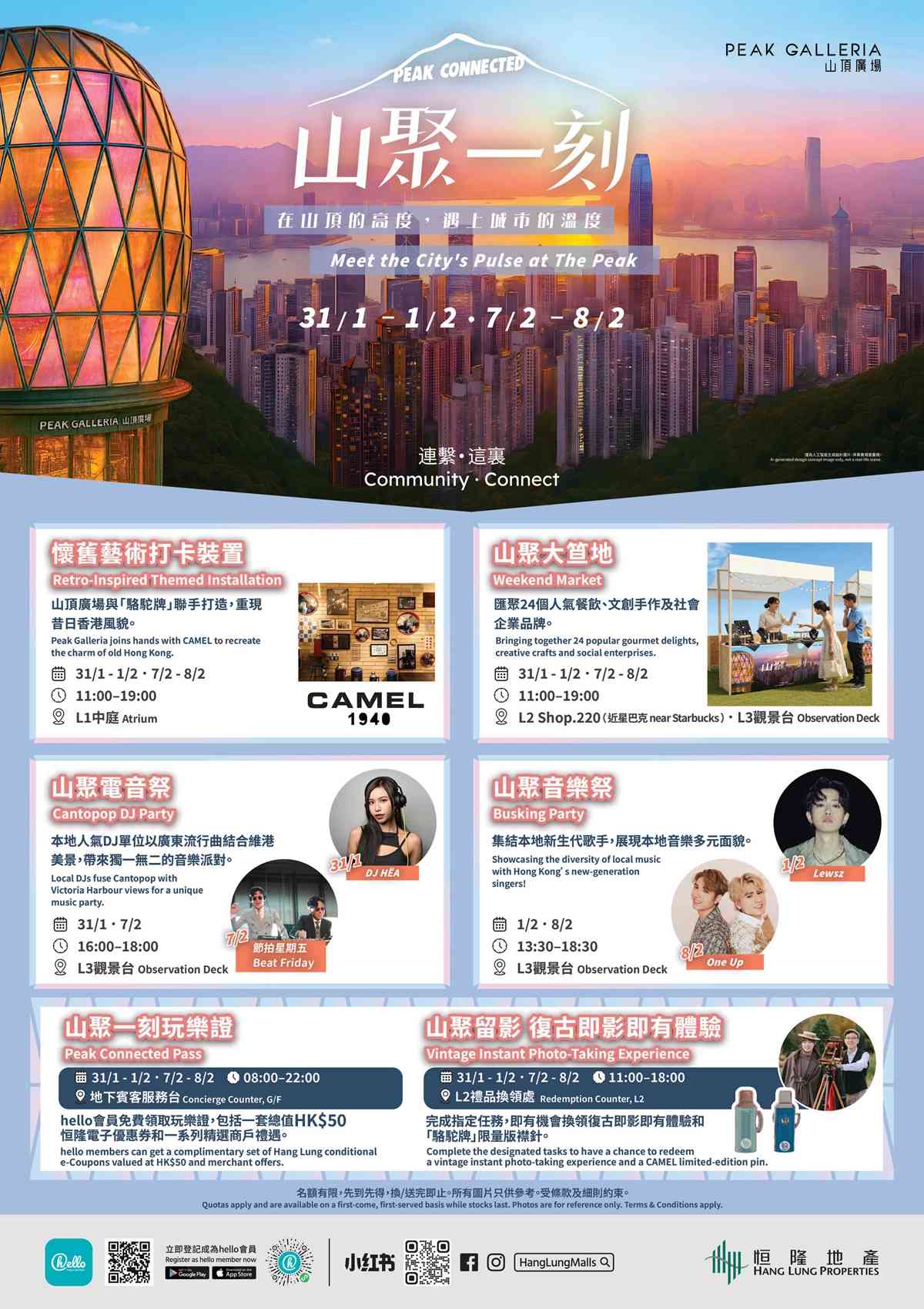 hello 会员于山顶广场宾客服务台扫描指定二维码,即可免费换领「山聚一刻玩乐证」一套总值HK$50恒隆电子优惠券,并可享多项商户独家礼遇!此外,hello 会员于山顶广场参与商户即日电子消费满HK$200或以上,或完成市集指定任务,即可获「山顶留影︰复古即影即有」,以维多利亚港的壮丽景色为背景,摄影师以古董木制相机为你拍摄独一无二的即影即有。每日首100名更可额外获得「骆驼牌」限量版襟针。
