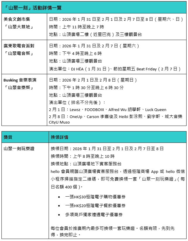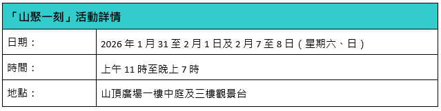 山顶广场将于2026年1月31日至2月1日及2月7日至8日,一连两个周末举办「山聚一刻」社区文化盛会。活动以「在山顶的高度,遇上城市的温度」为主题,汇聚一众本地青年创业家、音乐艺术单位和慈善团体,为他们提供展现独特才华的舞台。秉持恒隆「连系・这里」社区投资理念,活动旨在推动创意与文化发展、促进社区健康与共融,并鼓励青年多元发展及创业家精神,携手各界之力共建永续社区。文化盛会汇集多项精彩活动,包括:美食文创市集、广东歌DJ派对及Busking音乐表演,是次活动更与展能艺术家合作,带领大众携手进行集体艺术创作,在辽阔的山顶广场下,带来一场融合文化、艺术与社区精神的独特体验。