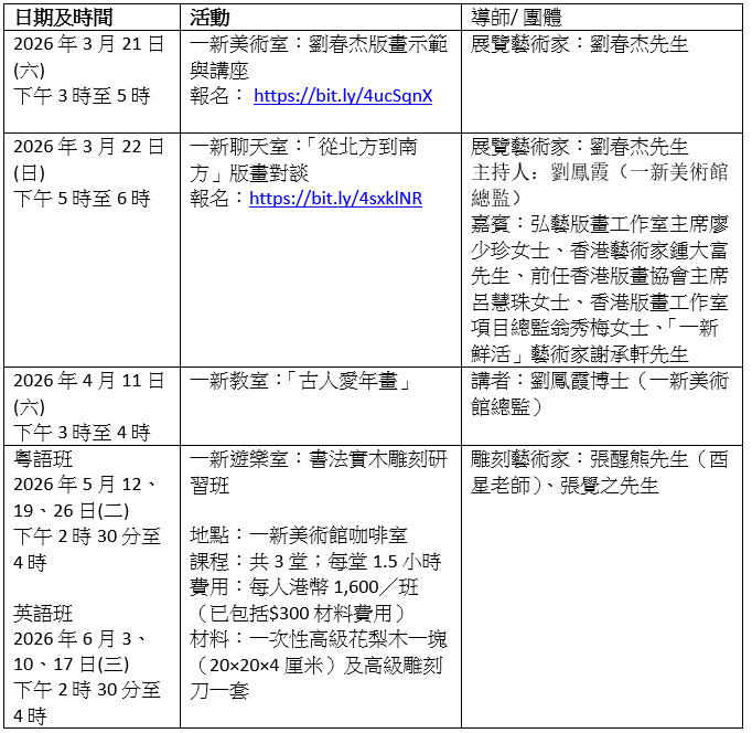一新美术馆呈献年度「一新亮点」项目 ——「深刻:刘春杰的原板与版画艺术」展览 。此展览为美术馆是庆祝一新美术馆10周年的重点项目,邀得中国版画艺术家刘春杰先生展示其跨越时空的艺术结晶,展期由2026年3月11日至6月14日。