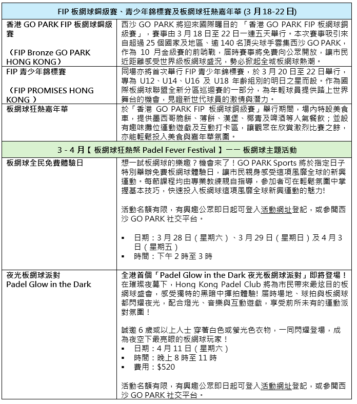 为进一步在港推广板网球这项新兴运动,西沙GO PARK联同国际板网球联盟(FIP)主办国际巡回赛事「香港GO PARK FIP板网球铜级赛(FIP Bronze GO PARK Hong Kong)」(3月18日至22日)及香港首办 FIP 青少年锦标赛,免费开放予公众入场,让大家近距离欣赏顶尖球手激战。同场举行的【板网球狂热嘉年华】更带来美食车、游戏摊位及互动打卡区,观众可边睇比赛边投入嘉年华氛围,享受运动与娱乐的双重体验!