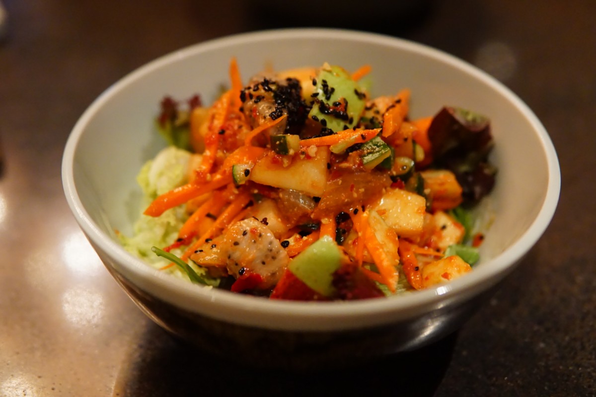 色彩繽紛的鮮果沙律充滿小島風情,採用的皆是新鮮時令的熱帶食材,包括如菠蘿、火龍果、大樹菠蘿、青蘋果和紅菊苣,非常豐富。沙律又配上羅望子辣椒醬和腰果,分外惹味辛香。