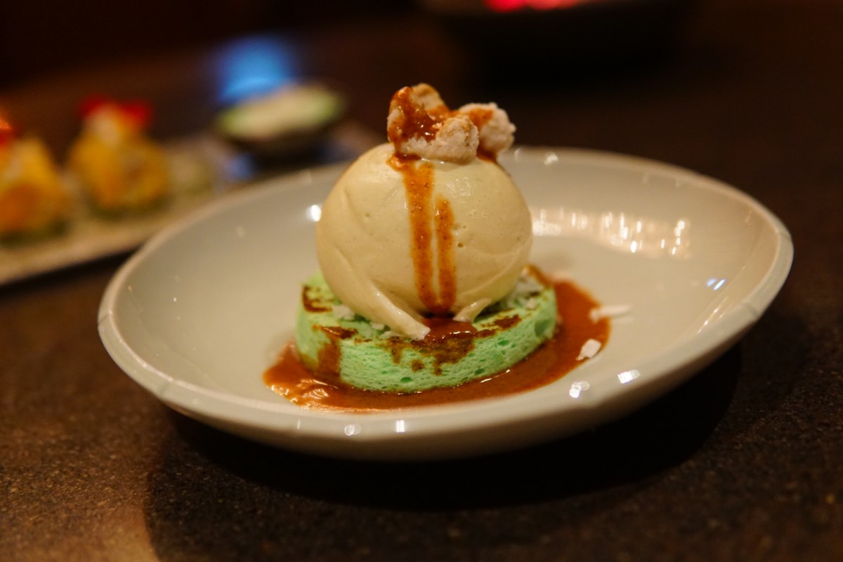 賣相誘人的斑蘭蛋糕輕盈鬆軟,內藏脆米加上外層沾滿焦糖脆脆及上椰子片,味道芒香濃郁。自家製香茅雪糕口味獨特,感覺十分清新。