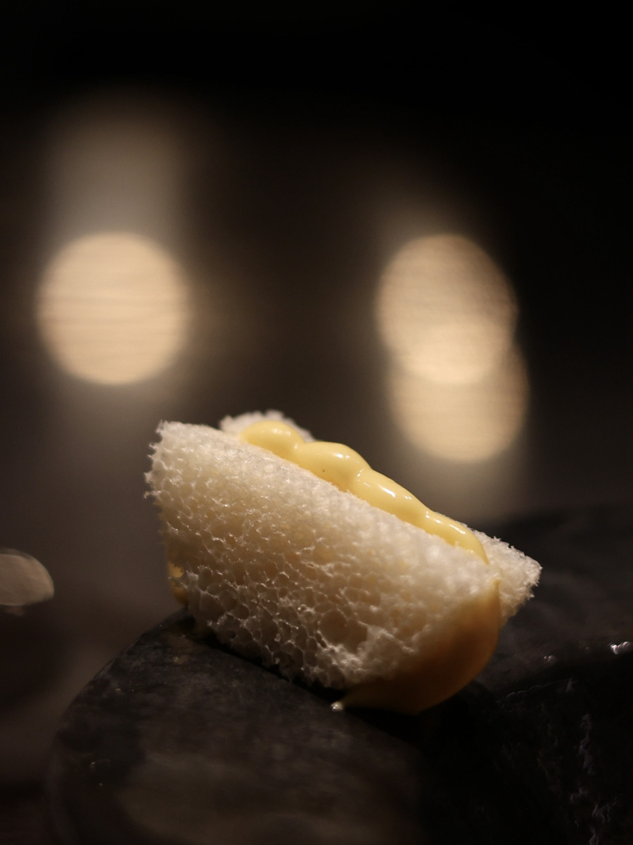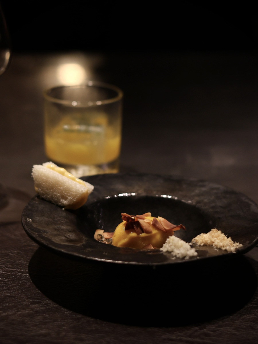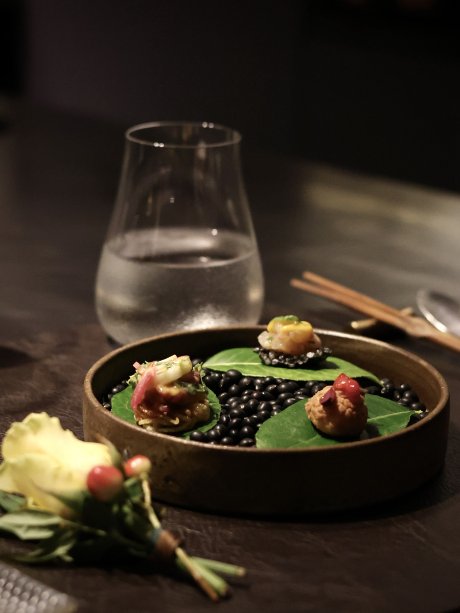 晚餐由三款餐前小吃開始,先來一口用黑龍江和牛炮製的他他,配上脆薯粒和橄欖油蛋黃醬,入口鮮香四溢,口感層次分明。之後是一款甜蝦他他,用上東海噴火灣甜蝦入饌,搭配墨魚汁西米薄脆和加入樹番茄製作的南乳醬,入口鮮甜惹味。最後一款是鴨肝泡芙,用上江蘇玉米鴨肝製成慕絲,填入自家製泡芙裡面,入口鹹香綿滑。