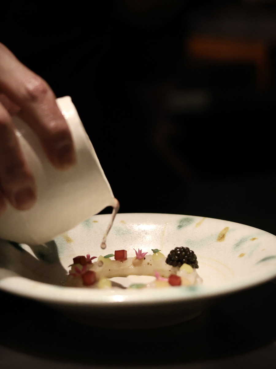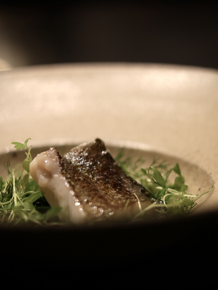 東海黃魚 – 用火槍燒香蒸熟的黃魚表皮,配上茴香苗、香芹苗和珍珠馬蹄,最後淋上沙薑雪菜泡沫,吃時魚肉細嫩,沙薑讓魚肉的鮮味加倍提升起來。配酒有2023年的意大利紅酒。