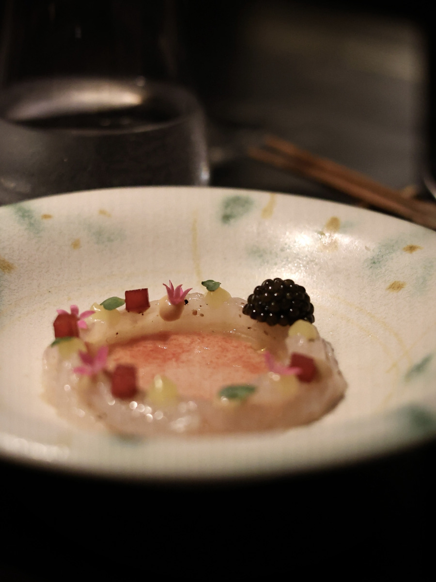 黑鯛魚 – 用上黑鯛魚刺身在盤子上圍成了一個圓圈,中間注入了香茅蕃茄凍湯,配上醃製李子,最後淋上普寧豆醬和鮮橙汁,置頂放上湖北宜昌產的魚子醬作點綴,同時滿足了味覺與視覺的追求。配酒有新西蘭的白葡萄酒。