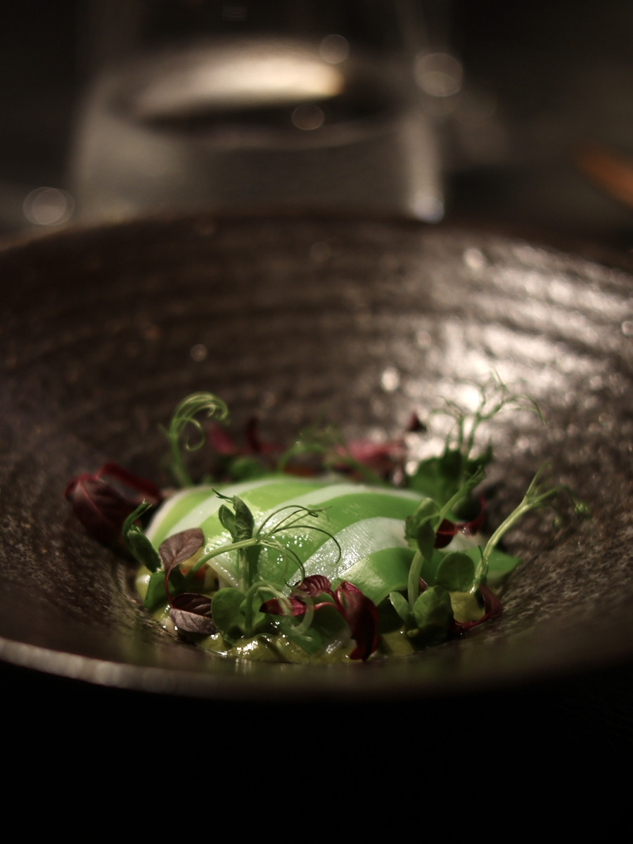 東海墨魚 – 先把東海墨魚切成薄片,搭配山蘇葉放於松葉蟹肉上面,加入西班牙風乾豬臉頰肉和香草醬,吃時口感豐富,味道鮮到一個點。