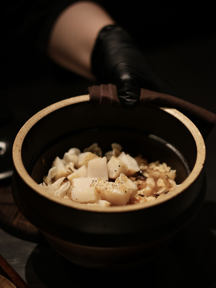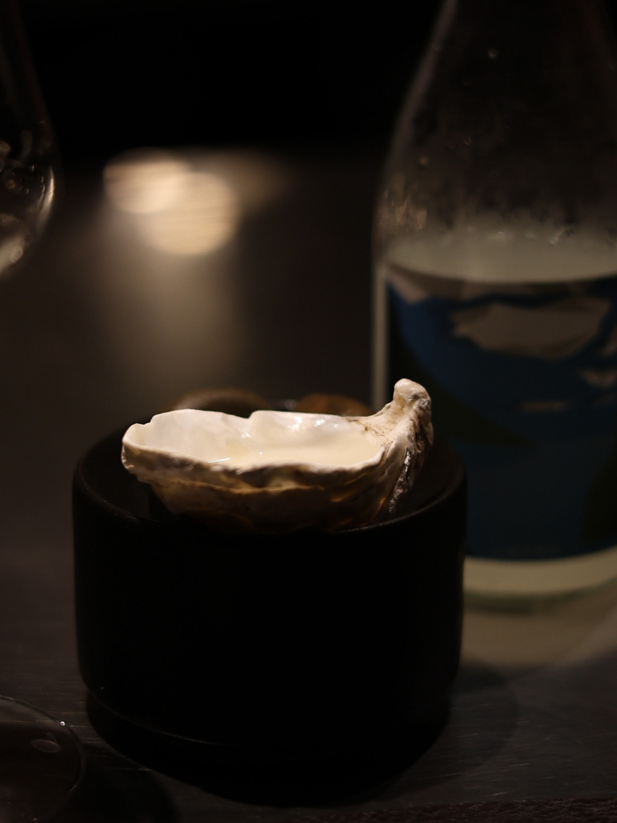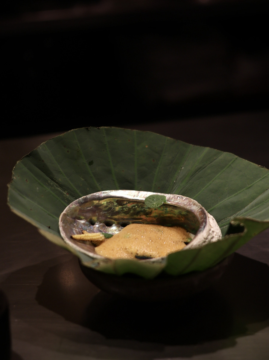 黑金鮑 – 先低溫處理黑金鮑再放上炭火上烤,配上雲南的松茸和新鮮毛豆,再注入豆瓣紫蘇泡沫,能品嚐到清楚的鮑魚鮮味。配酒有日本播州一獻純米吟釀,用上蠔殼來當酒杯,別有一番風味。