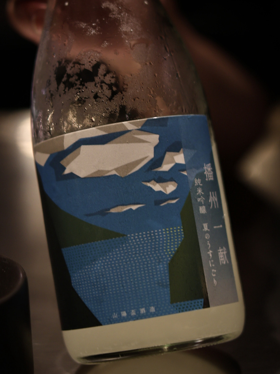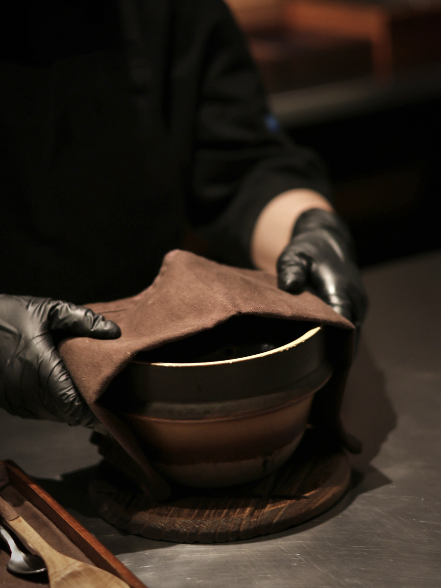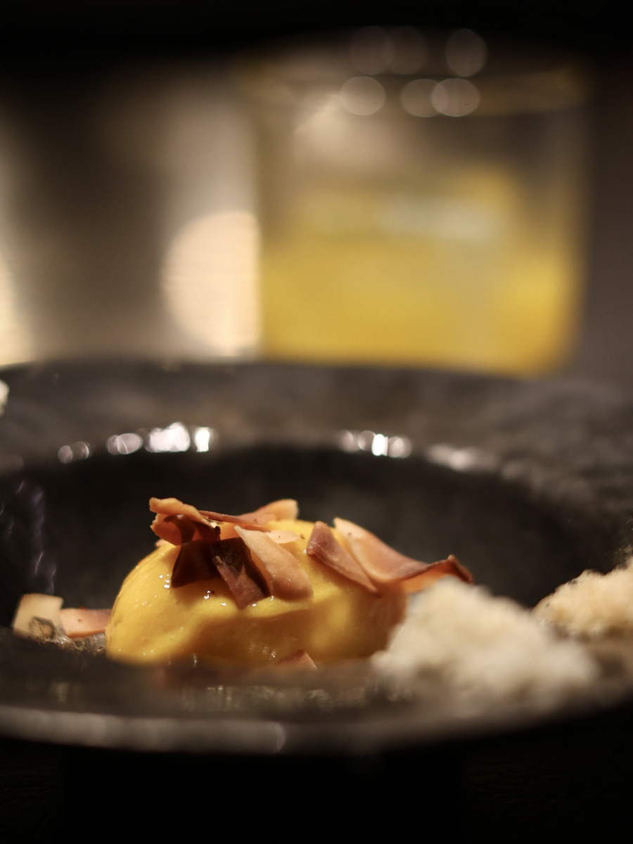 黑金鮑 – 先低溫處理黑金鮑再放上炭火上烤,配上雲南的松茸和新鮮毛豆,再注入豆瓣紫蘇泡沫,能品嚐到清楚的鮑魚鮮味。配酒有日本播州一獻純米吟釀,用上蠔殼來當酒杯,別有一番風味。