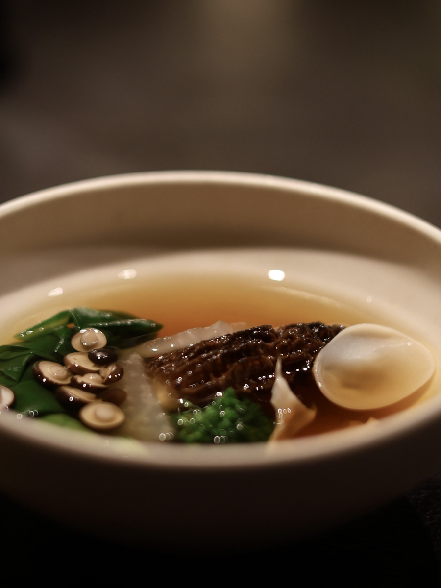 牛尾骨 – 先用牛尾骨、豬肉製成法式清湯,配上八種時令蔬菜,湯頭清澈,入口清甜,喝罷,暖身又暖心。
