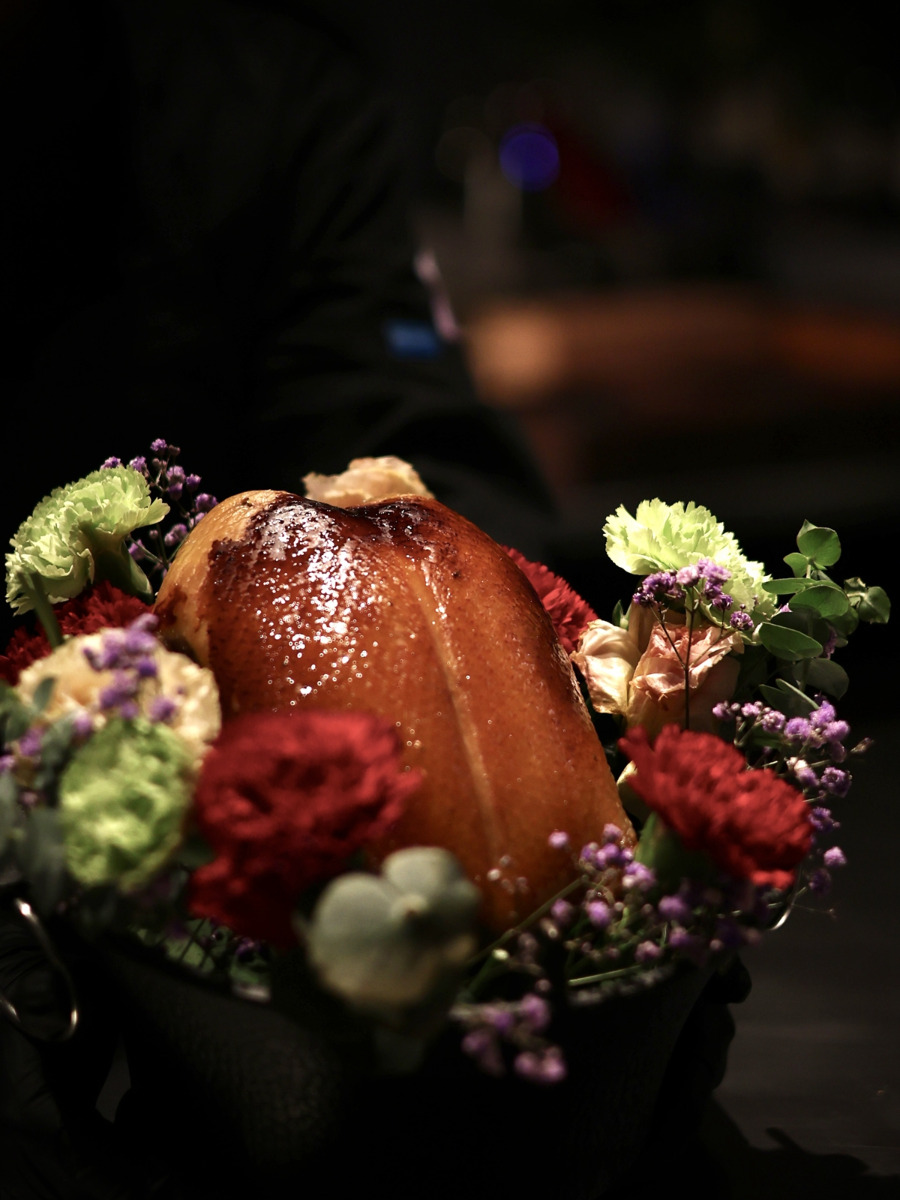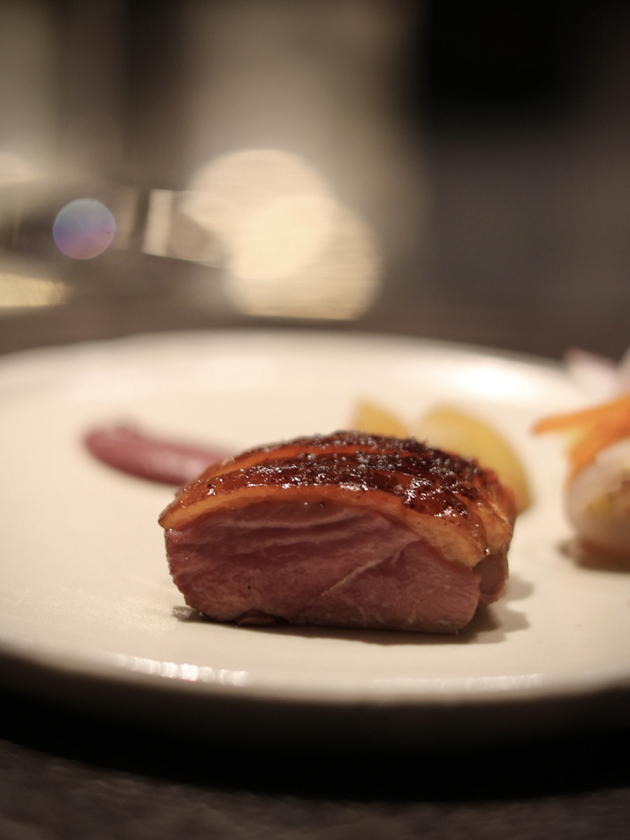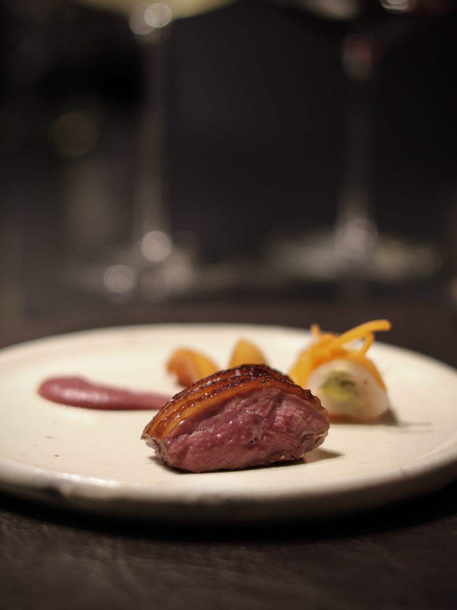 福建番鴨 – 先把經15天熟成處理的番鴨烤至七成熟,配上雲南玫瑰紫甘藍醬,一口吃下,能嚐到滿滿的鴨肉香,再來一口新疆吊幹杏漬物,瞬間消解油膩感。