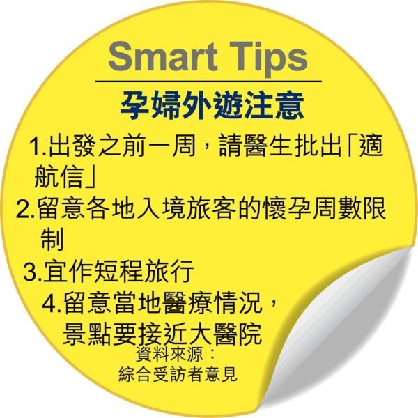 婦產科醫生靳嘉仁指,早年孕婦外遊多為公幹,但近年多了20至30歲的孕婦會作悠閒旅遊,每月最多有10宗個案,要求提供醫生證明以便乘搭飛機。靳稱,準媽咪在孕期的第13至28周最適合外遊,高齡產婦經評估後亦可起行。