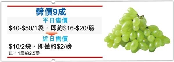 記者在北角春秧街的水果店,發現有15元2包的「澳洲」青提,共約5磅,平均每磅3元,水果價錢牌寫是「美國無核」,店員稱青提是美國入口。本周三,售價更減至10元兩袋。