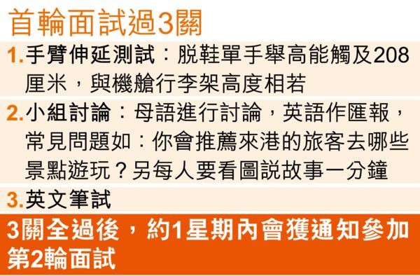 機艙服務部事業拓展及服務表現管理經理湛麗清說,應徵者面試時要以遊戲方式進行小組討論,從中考驗團體合作精神,若應徵者參與度不高、表現害羞,就未必適合。此外,飛行時難免會遇到種種突發情況,如有乘客暈倒,若考生及早考上急救牌照,即證明準備十足,或會加分。