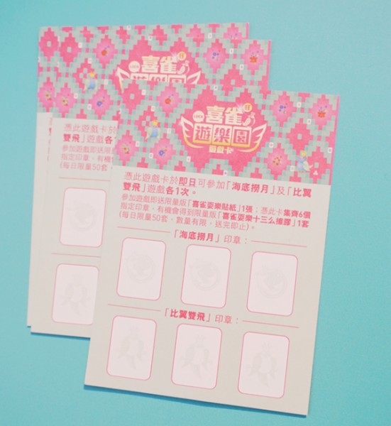 只要完成遊戲,即可獲贈「喜雀耍樂十三么貼紙」乙張;另外表現出色的遊戲王只要儲齊6個印章,即賞你像真度極高的限量版「喜雀耍樂十三么擦膠」,每日限量50份!
