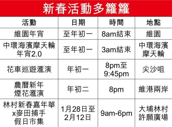 年初一(28日)及年初二(29日)分別有花車巡遊及煙花滙演。警方將於初一下午4時半起,在西九龍分階段採取封路措施,呼籲市民乘搭公共交通工具前往尖沙咀區。至於年初二煙花滙演,警方由傍晚6至8時封路。水警總區警司(行動)羅家康指,當晚會加強海上巡查,重點針對船隻超速,並提醒船上兒童須穿救生衣。