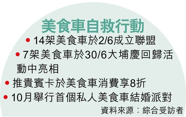 【晴報專訊】美食車計劃推出短短4個月,卻招徠部分經營者怨言指經營困難,為求「自救」,14架美食車將組成「香港美食車聯盟」,聯合起來推嘉年華等活動吸客,頭炮是6月底於大埔海濱公園的回歸20周年活動上亮相,更將推出貴賓卡等優惠予食客。