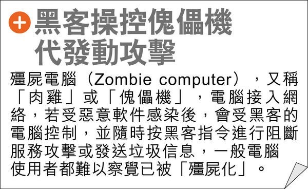 羅指,用家並不知道自己的電腦「中招」,指用家若發現電腦運行速度減慢、瀏覽網頁時常有廣告視窗彈出,很大機會已成為「殭屍電腦」。他提醒市民,黑客會假裝相熟親友或客戶身份,以電郵誘騙市民下載附件,入侵電腦或偷取個人資料,甚或利用受感染的電腦發送其他垃圾郵件及發動DDoS攻擊,最終可演變成科技罪案。
