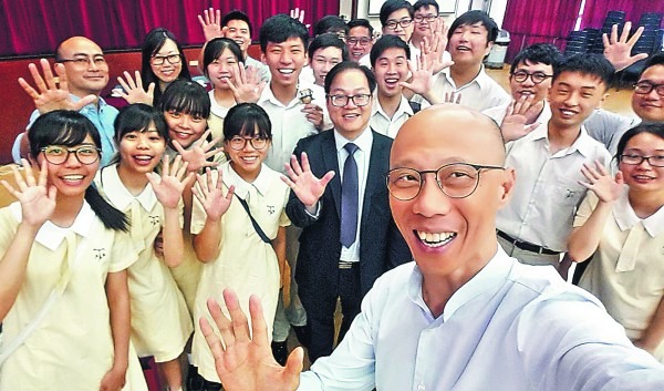 環境局局長黃錦星返母校聖文德中學和保良局第一張永慶中學,為師弟師妹加油。(黃錦星fb圖片)