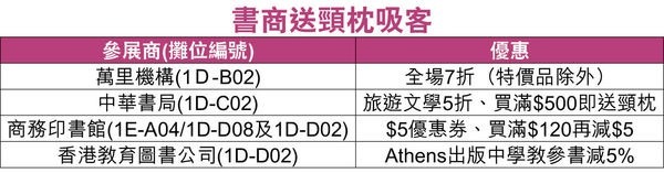 昨日參展商各施奇招「吸客」,望追回昨日上午暫停開放的生意。中華書局副總經理陳超英指,會場重開後即設臨時優惠區,所有旅遊文學均以5折發售;原需買滿800元才贈送的頸枕,亦降至買滿500元便贈送。她指,過去數日人流較去年少,加上昨日早上停開,若整體營業額能追回去年已相當不錯。而主要售賣英文圖書的Publishers Marketing Limited負責人吳偉基預計停開半日後,營業額會下跌3成。故昨午以半價促銷圖書套裝,並於未來兩日維持優惠。商務印書館在書展重開後亦即時加推優惠,在現場派發5元優惠券,另外,即場購物滿折實價120元,可再扣減$5。