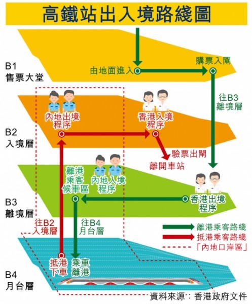 【晴報專訊】高鐵香港段一地兩檢方案終出爐,西九高鐵總站將劃出四分一樓面面積為內地口岸區,以租賃方式租予內地,在內地口岸區的刑事等事宜實施內地法律,部分情況如乘客間的民事法律事宜,則實施香港法律。而購高鐵票將採實名制,只有購票旅客和指定人員可進入口岸區。