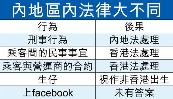 高鐵擬於明年第3季通車,政府公布一地兩檢方案,將西九高鐵總站內約10萬平方米劃為內地口岸區,連同列車車廂等範圍,以租賃形式交予內地使用和行使管轄權,視作香港範圍以外,受內地法律管轄,亦有個別範疇由香港法律管轄,包括乘客與營運商訂立的合約,及乘客間的民事法律事項等。路軌則歸香港管轄。