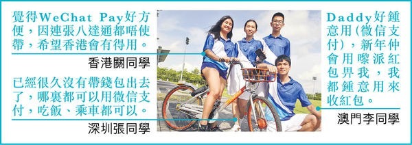 100名深港澳高中學生昨就率先在深圳體驗「無現金日」,學生用微信支付完成一連串任務,例如付款租共享單車、買書、團購等。升讀中六的香港女學生關同學指,她之前一直較少用微信支付,昨是首次試用,覺得非常方便。她坦言以前一直以為香港較內地發達,但今次體驗令她發現內地的無現金支付已相當普及,希望香港亦可以做到。