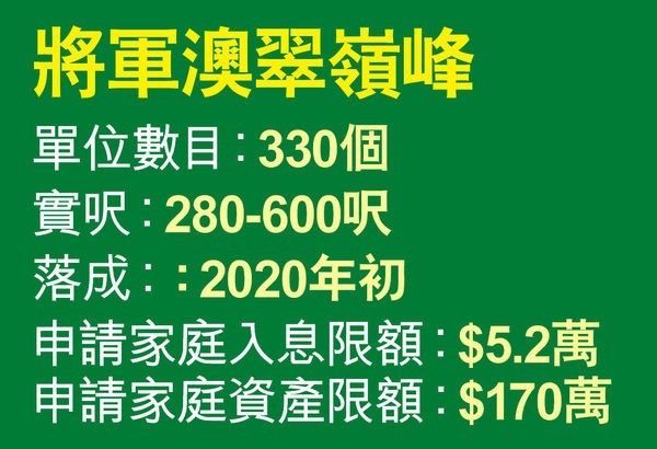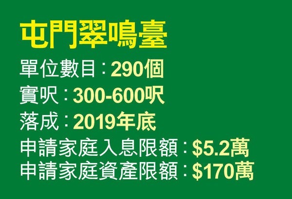 【晴報專訊】房協兩個資助出售房屋樓花將軍澳翠嶺峰及屯門翠鳴臺,今日將公布售價,明日對外開放示範單位,共涉620伙,預料申請資格與今期居屋看齊,家庭入息限額為5.2萬元,資產限額為170萬元,單身則減半。記者實地視察,兩盤周邊設施齊全,包括商場、食肆、街市、公園等。但有物管業界指,單幢樓因較少住戶攤分管理費,或收費較高。