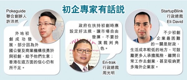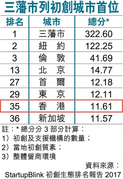 港府近年積極推動創新科技產業,全球創業者聯繫網絡機構StartupBlink最新發表的第四季全球初創城市排名報告中,三藩市、紐約及倫敦擁有最佳的初創生態系統,香港則排名35位。