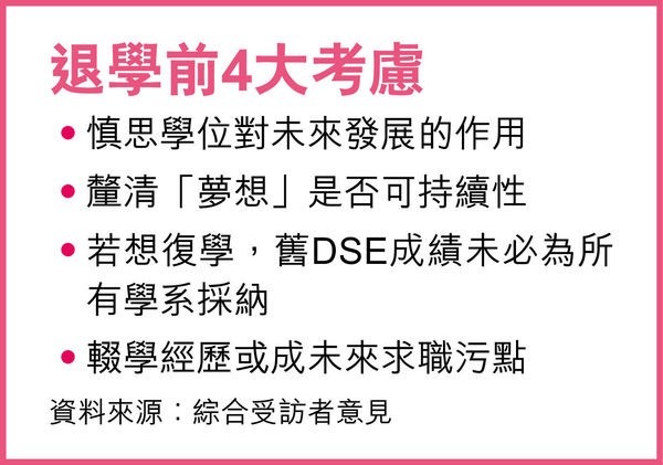 中大社工學系副教授陶兆銘在《大學線》指,學制改變或令DSE考生未如A-Level學生能在中學階段體驗「大學式教育」,亦缺時間作生涯規劃。東華學院商學院署理院長陳榮照對本報指,對學科乏興趣及感無前途是輟學主因,但輟學要考慮是為逃避壓力或有理想實踐;若退學後無所事事會是履歷污點。盈力僱員服務顧問首席顧問孫立民坦言︰「除非因健康理由輟學,否則僱主印象更差。」