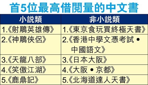 去年首10本借閱量最多的中文小說類書籍中,首8本都是金庸的武俠小說作品,而其餘兩本上榜作品則是亦舒的《某家的女兒》和《衷心笑》。至於首10本最高借閱量的中文非小說類書籍,9本都是旅遊「天書」,大部分是日本「天書」,只有一本是台灣,餘下一本是文憑試的應戰「天書」。