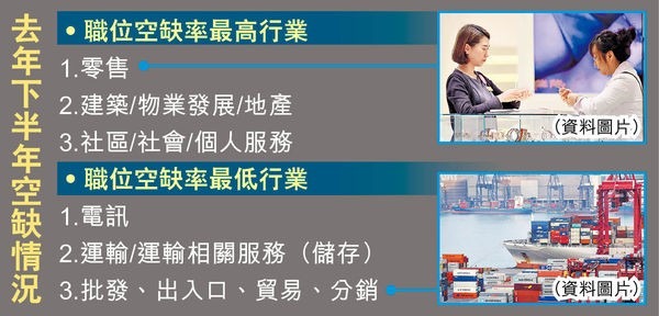 調查又發現,去年下半年職位淨增長最高的首3位行業包括「金融服務/銀行/保險」、「建築/物業發展/地產」和「零售」,其中「建築/物業發展/地產」和「零售」亦同佔去年下半年空缺率最高的首3個行業其中2個,第3個是「社區/社會/個人服務」。