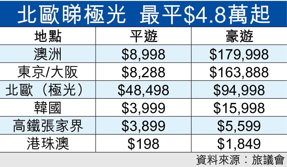 勝景遊產品發展部主管劉德平稱,今年聖誕團費平均加約5%,極光、冰島、南美南極團等,團費由4萬元至逾20萬元不等,逾25萬元的南美南極團亦爆滿。美麗華旅遊總經理李振庭亦指,今年長線團客路不受經濟影響,尤其是倫敦團及極光團,報團人數平均升20%至40%。旅議會總幹事陳張樂怡亦說,雖然經濟放緩,但超級豪華團客群不受影響。