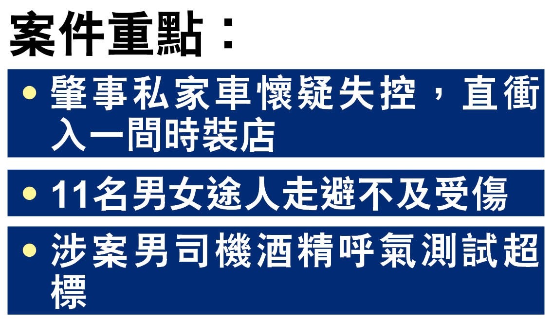【晴報專訊】尖沙咀昨發生嚴重交通意外,一輛私家車中午時分懷疑失控,直衝入金馬倫道首都廣場地下一間時裝店,導致11名途人受傷,其中一名男途人更一度被困車底;涉事男司機未能通過酒精呼氣測試,涉嫌酒後駕駛等罪行,當場被捕。