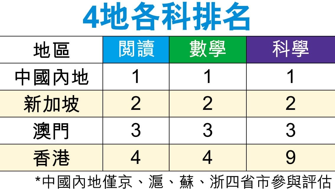 【晴報專訊】學生能力國際評估計劃(PISA)2018年結果昨揭盅,本港學生的閱讀及數學能力均由第2位跌至第4位;科學能力則續排第9位,3項排名均落後澳門,有學者形容是「警號」。教育局表示會參考排名,加以改進課程;有立法會議員則關注學生的學習壓力問題。