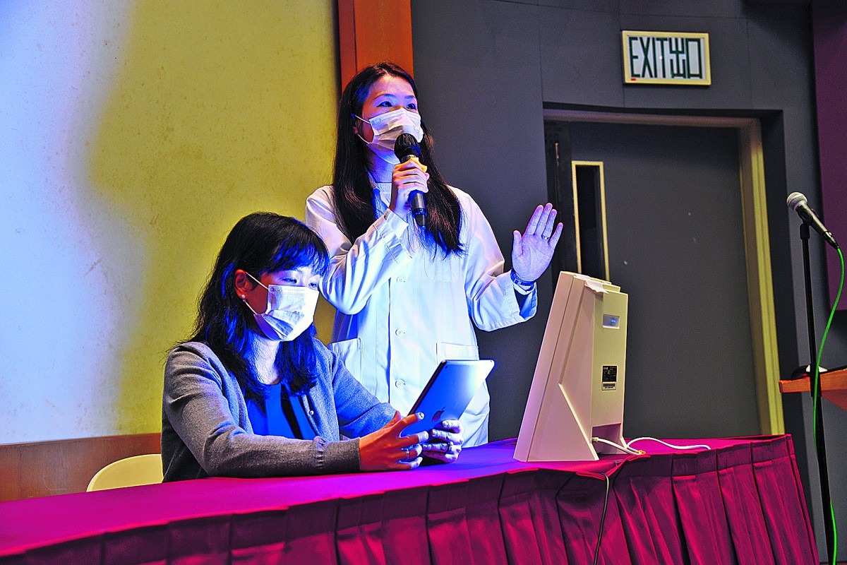 陳詠欣(右)李馨(左)示範時表示燈箱與患者會相距40厘米,患者睜開眼睛、但不要直視,而燈箱會過濾紫外線。