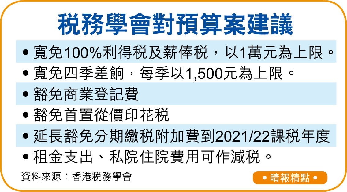 【晴報專訊】財政預算案下周三(23日)發表,香港稅務學會昨日稱,疫下不少商戶停業,應將資源集中用作支援相關受影響行業,同時派3,000元消費券紓民困。因應國際稅務環境變動,學會建議把握機會檢討稅制,包括擴闊稅基,以維持本港競爭力及長遠財政穩健。
