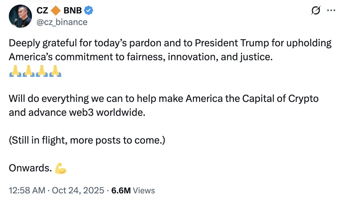 趙長鵬在X平台上發文感謝。稱要幫助美國成為全球加密之都。
