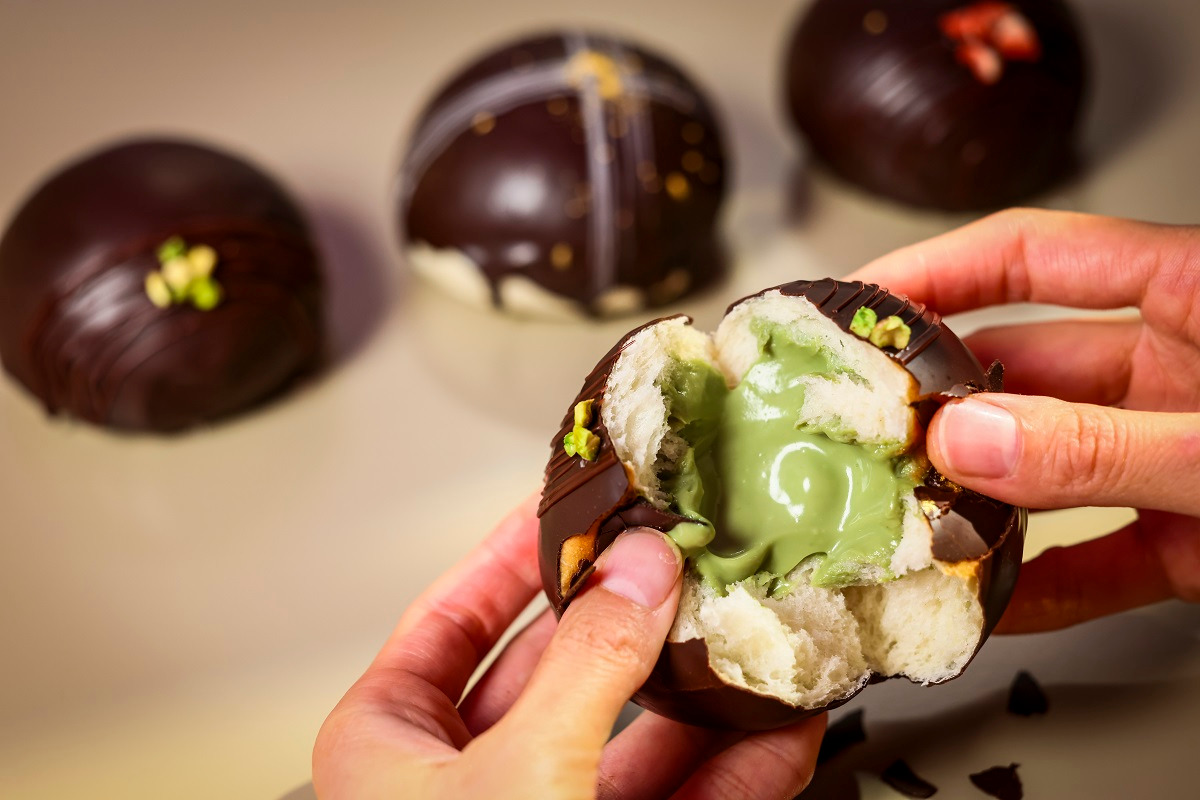 同樣每日限量50件還有脆皮爆餡波波!三款口味分別為北海道忌廉、紅桑子朱古力忌廉及開心果朱古力忌廉,咪睇佢看似朱古力,其實係麵包!外層包著 朱古力脆脆外皮,咬落去「咔嚓」一聲超滿足,朱古力控must try!脆皮爆餡波波內裏餡料濃厚足料,配上軟綿麵包體,由外脆到內軟,口感對比極強,每日每款限量50件。