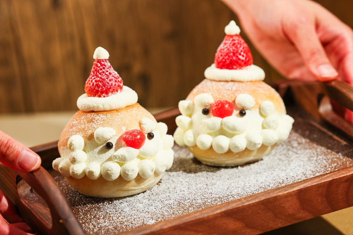 聖誕老人布甸生乳包,中間夾入 香滑蘭王布甸 與 北海道生乳忌廉,奶香濃郁。