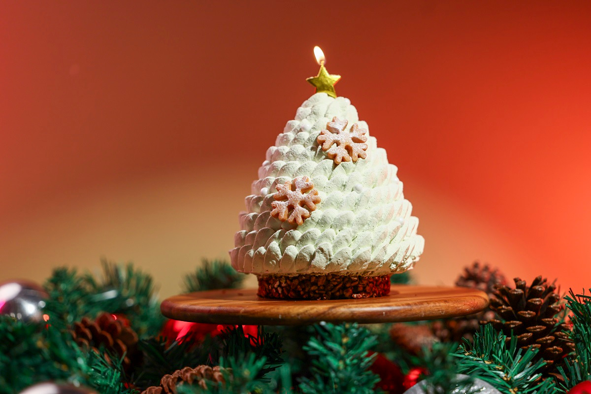 聖誕樹開心果北海道忌廉蛋糕使用北海道忌廉打造輕盈奶香外層,日本開心果海綿蛋糕堆疊聖誕樹造型,每層中間有滿滿芒果肉,夾層的開心果醬襯托出極致聖誕。