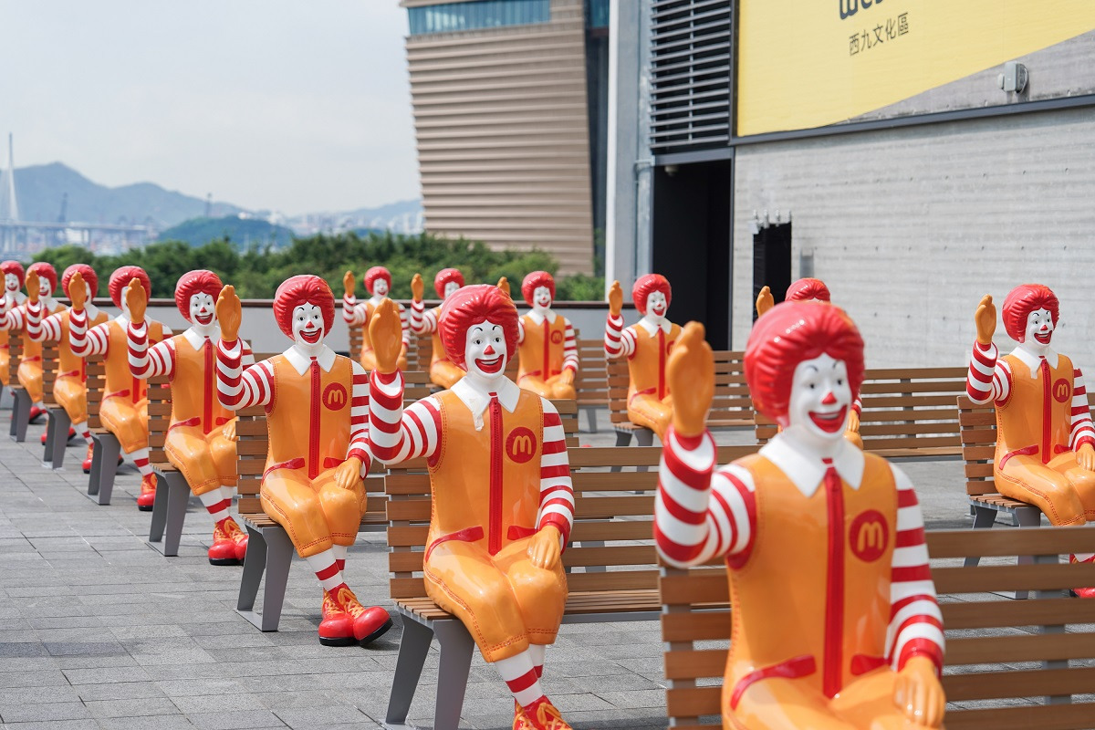 為慶祝 50 周年而擺設的 20 張經典麥當勞叔叔長櫈,絕對是視覺衝擊,同場更有及放大版美食打卡位。