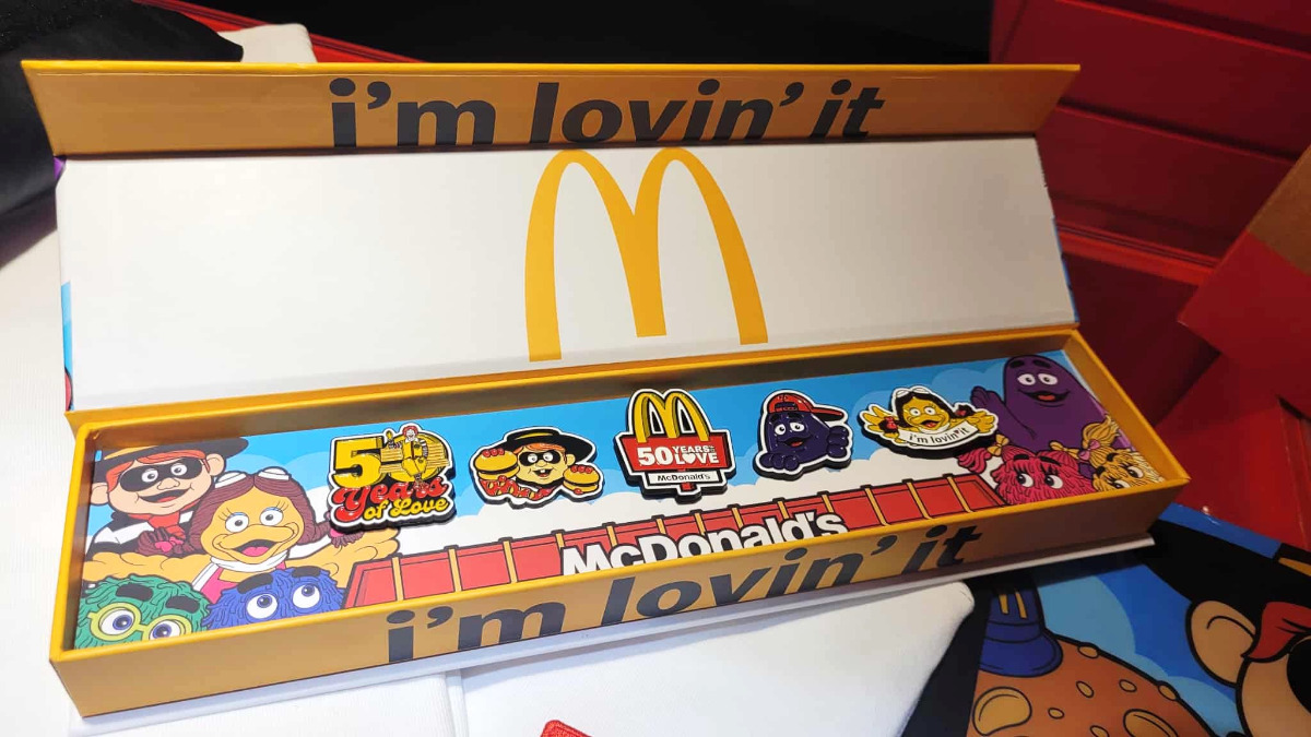 I’m lovin’ it 期間限定店即場發售多款限量 50 周年紀念精品,包括別注版 T-Shirt(白色/黑色)、刺繡棒球外套(紅色/黑色)、帆布袋、文件夾套裝、滑嘟嘟縮骨遮、復古變型公仔套裝以及 50 周年襟章套裝。所有物品數量有限,售完即止,部分收益將撥捐予麥當勞叔叔之家慈善基金。