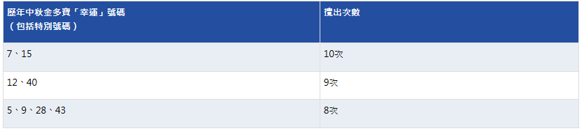 自1985年舉辦以來已舉辦39次中秋金多寳,根據過往開獎數據統計,「7」號及「15」號開出過10次最多,而「12」號及「40」號亦攪出9次。「5」號、「9」號、「28」號及「43」號則出現過8次,大家覺得有冇參考價值?
