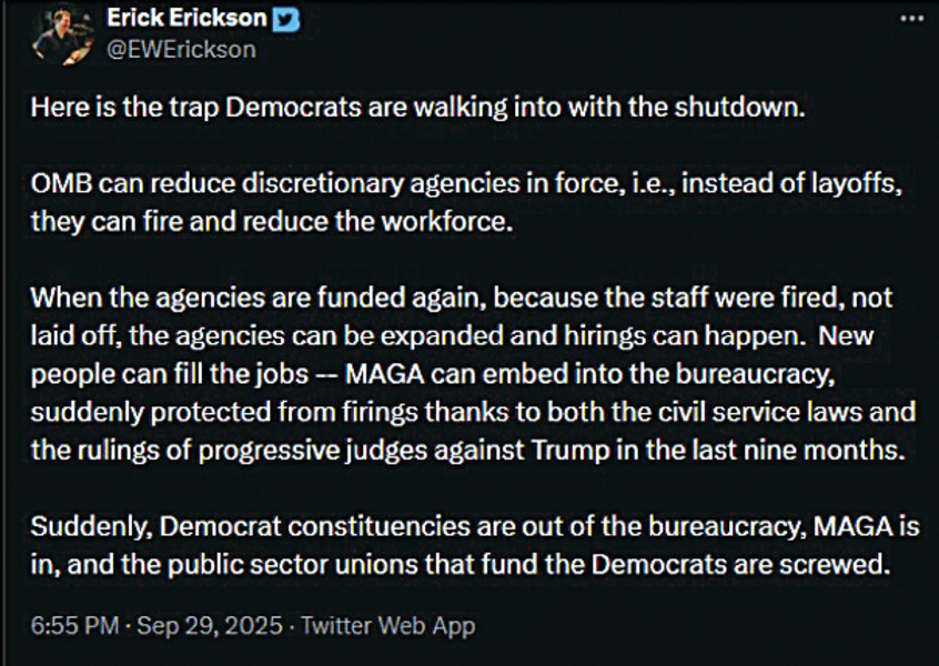 今次特朗普的炒人是不惜將政府部門的人員炒過底朝天,目的就是要安他的人,進入政府,好得日後可以指那打那,發揮出個「獨裁」的政府體制出來。