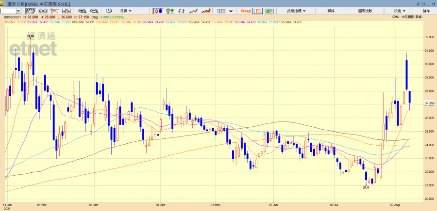 目前未知官方打擊「炒芯」成效,惟晶片生產商上半年業績大幅增長,有望支持全年盈利增長。中芯國際日前公布截至6月30日止第二季純利約6.87億美元,按季升3.33倍,按年升約4倍,每股盈利0.09美元。該集團指,第三季指引,季度收入環比增加2%至4%。毛利率介於32%至34%的範圍內,更展望全年銷售收入增長目標和毛利率目標上調到30%左右。因折舊攤薄,預計今年先進制程對整體毛利率的不利影響將下降到5個百分點左右。