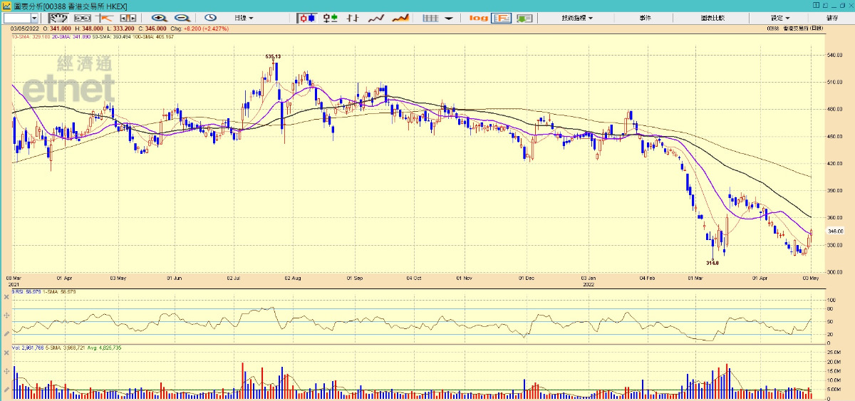 港交所近期兩度測試318.4元見支持後持續回升。(經濟通HV2報價系統截圖)