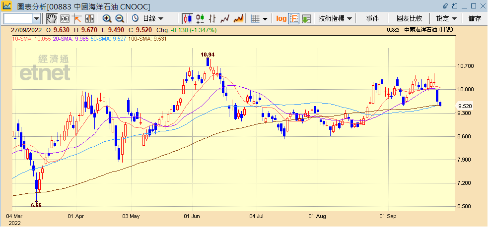國際油價持續受全球經濟衰退風險加劇及美元強勢影響,繼上周五(23日)大跌半成後,昨日(26日)再跌逾2%,續創年內新低,而「三桶油」繼昨日大跌後,今日(27日)仍未止跌,其中中海油(00883)再跌逾1%,已跌至個半月來橫行區底部關鍵位置。摩通和高盛等大行仍料供應緊張可支撐油價,看好油價第四季可重返三位數,加上高息及回購等或可支持中海油股價反彈。
