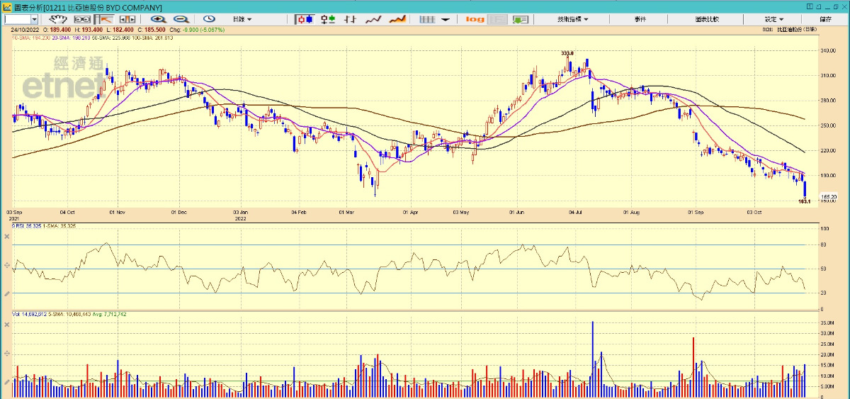 比亞迪現價已跌穿170元水平,接近3月低位164.8至165元,目前165元位置非常關鍵,若進一步失守將要再下試2021年5月低位約138元水平。但即使165元大關勉強守住,亦需要消息面配合,如政策面上延長免徵新能源車購置稅,以至加大購車補貼等等重大利好消息才能帶動向上修復。